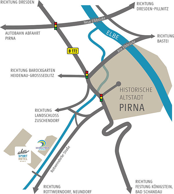 Von der Autobahn A17 Abfahrt Pirna folgen Sie der Hotelroute B (grün) auf die B 172. Nach Erreichen des Wegweisers Hotelroute R (blau) folgen Sie der Hauptstraße bis zu unserem Hotel.